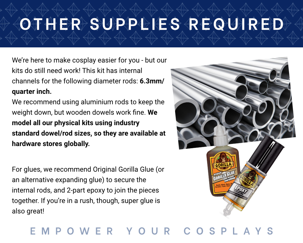 Olivia Armstrong's Sword measures approx. 95cm in length, the prop and has internal channels modelled in for dowels to add strength to the internal structure (we recommend using aluminium rods to reduce weight):